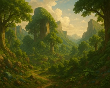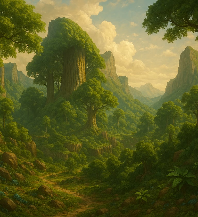 Sylvaran é uma imensa floresta viva que repousa sobre uma massa rochosa colossal, com raízes gigantescas que descem até o vazio. Montanhas cobertas de musgo, cavernas iluminadas por cristais e árvores milenares que tocam os céus formam o coração deste continente. As criaturas daqui — golems, bestas colossais e seres de madeira — guardam ferozmente os segredos da natureza. Seus habitantes constroem vilas em harmonia com a floresta, erguendo casas nos troncos de árvores sagradas. Sylvaran é o continente da resistência, da força vital e da conexão com a própria essência do planeta.