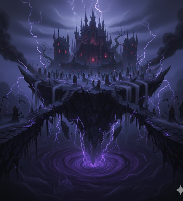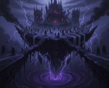 O Castelo Sombrio ergue-se no coração do continente das Sombras, cercado por um vale coberto de névoa roxa e relâmpagos negros que cortam o céu. Suas torres são altas e tortas, feitas de uma pedra escura que parece absorver a luz. As janelas brilham com um tom esverdeado, como se almas presas olhassem de dentro.